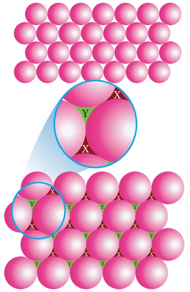 இந்த வெற்றிடம் / துளை, x அல்லது y ன் மீது கோளங்களை அடுக்குவதன் மூலம் இரண்டாவது அடுக்கினை உருவாக்கலாம். இடைவெளி (வெற்றிடம்) x ன் மீது கோளங்களை அடுக்கி இரண்டாவது அடுக்கினை உருவாக்கும் ஒரு நேர்வினை நாம் கருதுவோம்.