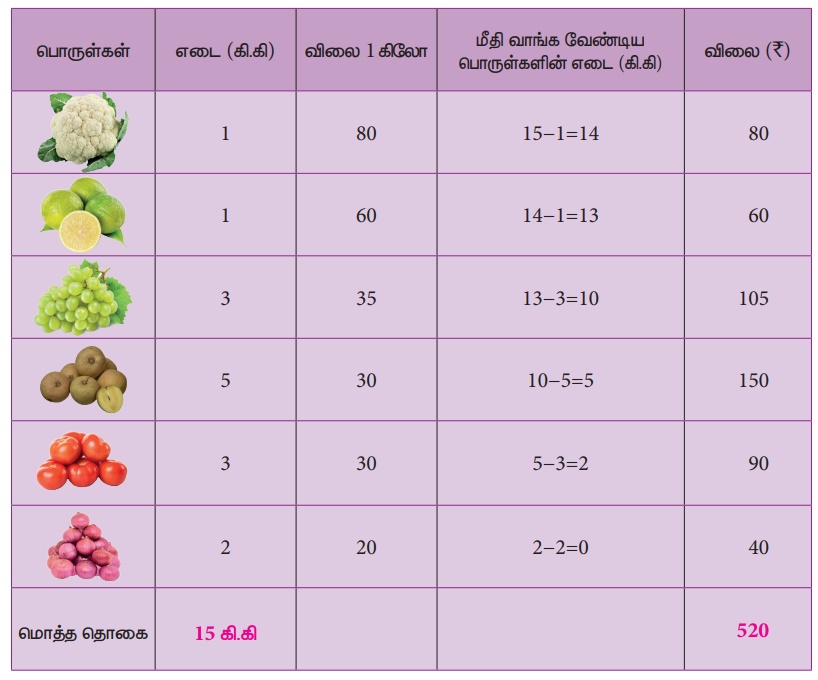 அதிகபட்சமாக பொருளின் எடை 15 கி.கி ஆக இருக்க, மீதம் 1 கிகி சப்போட்டா வாங்கினால் போதும். எனவே, 1 கிலோ சப்போட்டாவின் விலை ₹30 எனக் கணக்கிட்டு, 15 கிலோ காய்கறிகள் மற்றும் பழங்களை வாங்க இந்த அணுகுமுறையில் ₹475 செலவிடுவோம்.