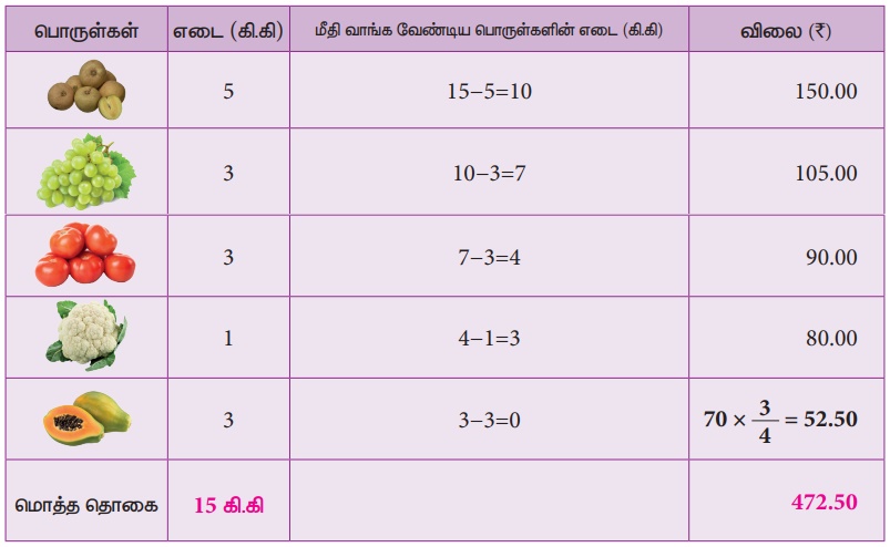 அதிபட்சமாக பொருளின் எடை 15 கி.கி ஆக இருக்க மீதம் 3 கி.கி பப்பாளி வாங்கினால் போதும். எனவே, 3 கிலோ பப்பாளியின் விலை ₹52.50 எனக் கணக்கிட்டு, 15 கிலோ காய்கறிகள் மற்றும் பழங்களை வாங்க இந்த அணுகுமுறையில் ₹472.50 ரூபாய் செலவிடுவோம்.
