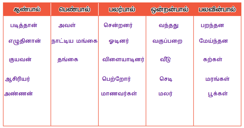 அவள், சென்றனர், படித்தான், வந்தது, பறந்தன. ஓடினர், எழுதினான், விளையாடினர், குயவன், நாட்டிய மங்கை, மேய்ந்தன, வகுப்பறை, கற்கள், ஆசிரியர், மாணவர்கள், வீடு, பெற்றோர். தங்கை, அண்ணன், மரங்கள், செடி, மலர், பூக்கள்.