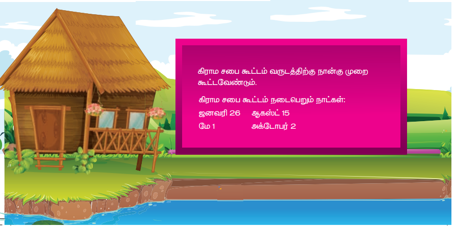 * ஊராட்சி மன்றம் கிராம மக்களுக்கு அடிப்படை வசதிகளை அளிக்கிறது என்பதனைத் தெரிந்து கொள்ளல்