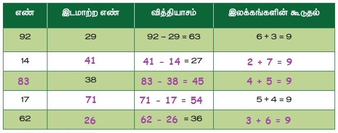 ஓர் ஈரிலக்க எண்ணை அதன் இலக்கங்களை இடவலமாக மாற்றி அவ்வெண்ணிலிருந்து கழிக்க 9இன் மடங்கு கிடைக்கும்.