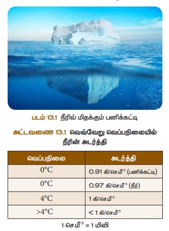 வெப்பநிலைகளில் நீரின் அடர்த்தியானது அட்டவணை 4.1ல் கொடுக்கப்பட்டுள்ளது.