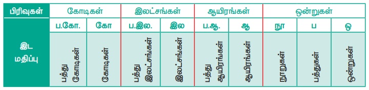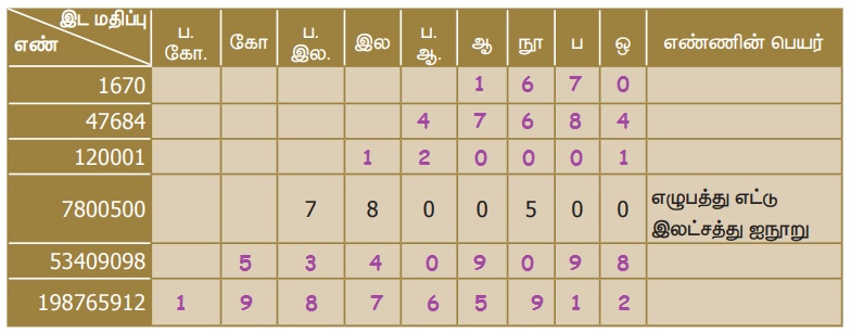 குறிப்பு : ஓர் எண்ணின் இலக்கங்களின் இடமதிப்பு வலதுப்புறத்திலிருந்து இடதுப்புறமாகச் செல்ல செல்ல அதிகரிக்கும்.