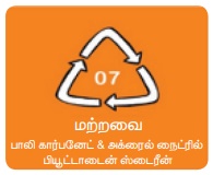 ● ஸ்டைரின் என்பது இந்த வகை நெகிழியின் கட்டுமானப் பொருளாகும். இது புற்றுநோயை விளைவிக்கும்.