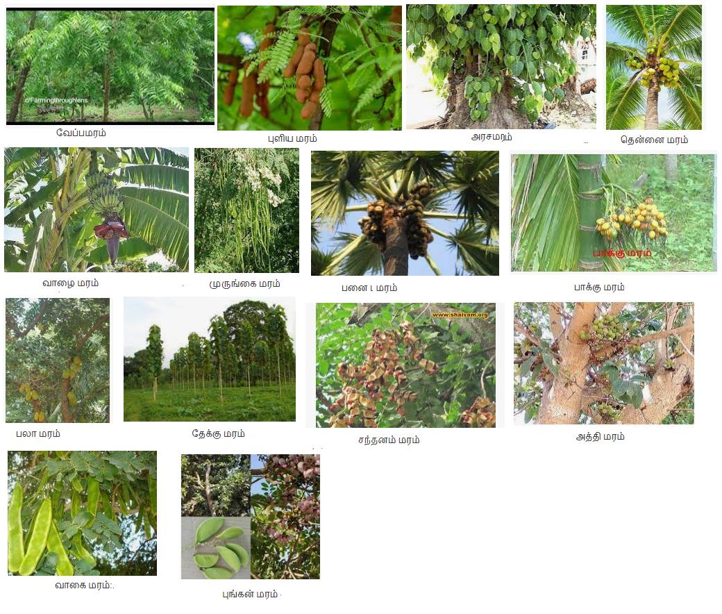 வேப்ப மரம், புளிய மரம், அரசமரம், ஆல மரம், வாழை மரம், முருங்கை மரம், தென்னை மரம், பனை மரம், பாக்கு மரம், பலா மரம், தேக்கு மரம், சந்தன மரம், அத்தி மரம், வாகை மரம், புங்க மரம்.