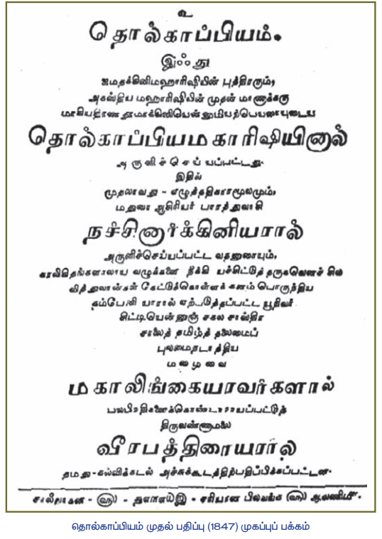 நமக்குக் கிடைக்கும் தமிழ் நூல்களில் காலத்தால் பழமையான இலக்கண நூல் தொல்காப்பியம். இதன் ஆசிரியர் தொல்காப்பியர். தொல்காப்பியம் எழுத்து, சொல், பொருள் என மூன்று அதிகாரங்களைக் கொண்டது. ஒவ்வொரு அதிகாரத்திலும் ஒன்பது இயல்களாக மொத்தம் இருபத்தேழு இயல்கள் உள்ளன. தொல்காப்பியத்திற்குப் பலர் உரை எழுதியுள்ளனர். அவர்களுள் பழமையான உரையாசிரியர்கள் இளம்பூரணர், நச்சினார்க்கினியர், கல்லாடனார், சேனாவரையர், தெய்வச்சிலையார், பேராசிரியர் ஆகியோர் ஆவர். நச்சினார்க்கினியரின் சிறப்புப்பாயிர உரைவிளக்கத்தில் உள்ள பாடல் பாடமாக இடம் பெற்றுள்ளது.