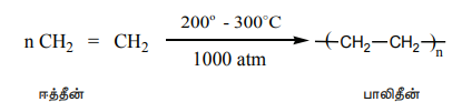 இது ஈத்தீனின் சேர்ப்பு பலபடியாகும். இரண்டு வகையான பாலித்தீன்கள் உள்ளன. i) HDPE (உயர் அடர்த்தி பாலிஎத்திலீன்) ii) LDPE (குறை அடர்த்தி பாலிஎத்திலீன்).