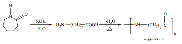 533K வெப்பநிலையில், மந்த வாயுச் சூழலில் சிறிதளவு நீருடன் காப்ரோ லாக்டம் (ஒற்றைப்படி மூலக்கூறு) ஐ வெப்பப்படுத்தும்போது € - அமினோ காபராயிக் அமிலம் பெறப்படுகிறது, இது பலபடியாக்கள் அடைந்து நைலான் - 6 எனும் பலபடி கிடைக்கிறது.