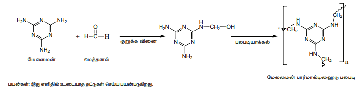 மேலமைன் மற்றும் ஃபார்மால்டிஹைடு ஆகியன இதன் ஒற்றைப்படி மூலக்கூறுகளாகும். இந்த ஒற்றைப்படி மூலக்கூறுகள் குறுக்க பலபடியாக்கல் வினைக்கு உட்பட்டு மேலமைன் ஃபார்மால்டிஹைடு பிசினை உருவாக்குகின்றன.