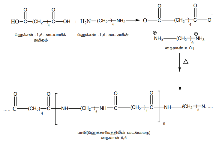 சமஅளவு மோல் எண்ணிக்கையில் அடிப்பிக் அமிலம் மற்றும் ஹெக்ஸா மெத்திலீன் டையமீன் கலந்து நைலான் உப்பு பெறப்படுகிறது. இந்த உப்பை வெப்பப்படுத்தும்போது நீர் மூலக்கூறு வெளியேறுவதால் அமைடு பிணைப்புகள் உருவாகி நைலான் - 6,6 கிடைக்கிறது.
