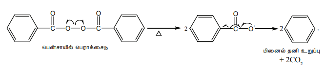 ஆல்கீன்களை, பென்சாயில் பெராக்சைடு போன்ற தனி உறுப்பு துவக்கிகளுடன் வெப்பப்படுத்தும்போது அவை பலபடியாக்கல் வினைக்கு உட்படுகின்றன. எடுத்துக்காட்டாக பெராக்சைடு துவக்கி முன்னிலையில் ஸ்டைரீன் பலபடியாக்கலுக்கு உட்பட்டு பாலிஸ்டைரீனை தருகிறது. இந்த வினையின் வினைவழி முறையானது பின்வரும் படிகளில் நிகழ்கிறது.