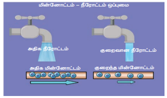 மின்னோட்டம் பாய்வதற்கும் நீரோட்டத்திற்குமான ஒப்புமையை இப்போது நாம் பார்ப்போம்.