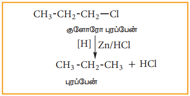 ஆல்கைல் புளுரைடுகளை தவிர, மற்ற ஆல்கைல் ஹாலைடுகள், பிறவிநிலை ஹைட்ரஜனால் ஒடுக்கமடைந்து ஆல்கேன்களாக மாற்றப்படுகின்றன. ஒடுக்கத்திற்கு தேவைப்படும் ஹைட்ரஜனை கீழ்கண்ட ஒடுக்கும் காரணிகள் மூலம் பெறலாம்: Zn+HCl, Zn+CH3 COOH, எத்தனாலில் உள்ள Zn-Cu இணை, LiAlH4 முதலியன.,