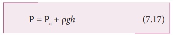 நாம் மட்டம் 1 ஐ நீரின் மேற்பரப்பிலும் அதாவது காற்று நீர் இடைப்பகுதி, மட்டம் 2 ஐ மேற்பரப்பிற்கு கீழே h ஆழத்திலும் (படம் 7.10 (ஆ) இல் காட்டியுள்ளவாறு) தேர்வு செய்தால் h1 மதிப்பு சுழியாகும் (h1 = 0) மற்றும் P1 காற்றழுத்தத்தின் மதிப்பைப் பெறுகிறது Pa மேலும் h ஆழத்தில் அழுத்தம் (P2) ஆனது P என்ற மதிப்பைப் பெறும். இந்த மதிப்புகளை சமன்பாடு (7.16) இல் பிரதியிட