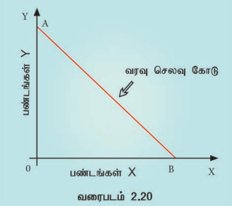 ஒரு குறிப்பிட்ட வருமானத்தில் (C), BA என்பது வரவு செலவுக்கோடு C/OA என்பது Y பண்டத்தின் விலை மற்றும் C/OB என்பது X பண்டத்தின் விலையாகும். வரவுசெலவுக் கோடானது வருமானம் மற்றும் பண்டத்தின் விலை நிலையாக இருக்கும்போது, முழு வருமானத்தையும் பயன்படுத்தி இரண்டு பண்டங்களை வாங்க நுகர்வோருக்குள்ள பல்வேறு இணைப்புகளைக் காட்டுகிறது.