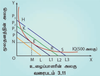 E என்ற புள்ளியில் நிறுவனம் OM அலகு உழைப்பையும் ON அலகு மூலதனத்தையும் பயன்படுத்துகிறது.