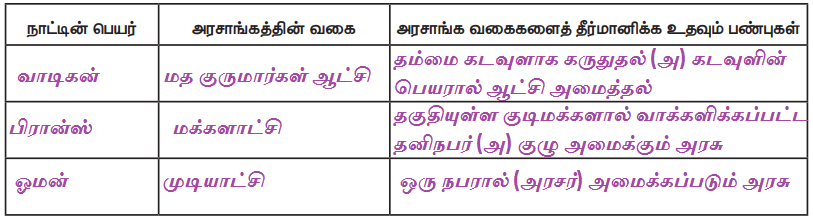 குறிப்பிட்ட நாடுகளை தேர்வு செய். ஒவ்வொரு நாட்டையும் ஆராய்ந்து அந்நாட்டின் அரசாங்கம் - உயர்குடியாட்சி, முடியாட்சி, தனிநபராட்சி, சிறுகுழு ஆட்சி, மதகுருமார்கள் ஆட்சி, மக்களாட்சி குடியரசு - இவற்றில் எந்த வகையைச் சார்ந்தது என்பதைக் கூறவும் : பின்னர் அரசாங்க வகைகளைத் தீர்மானிக்க உதவும் பண்புகளை விவரி