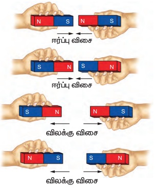 N-S) ஒன்றையொன்று ஈர்க்கின்றன. ஒத்த துருவங்கள் (N-N, S-S) ஒன்றையொன்று விலக்குகின்றன.