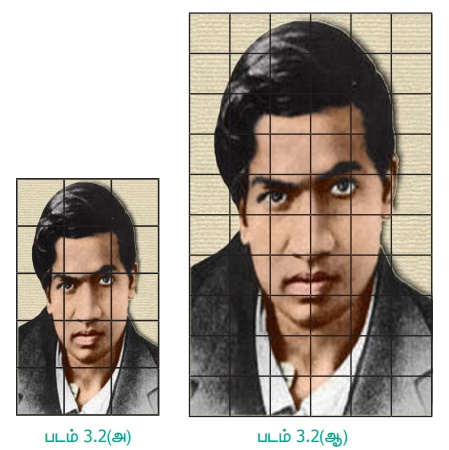 படம் 3.2 (அ) இல் கணித மேதை சீனிவாச இராமானுஜரின் புகைப்படம் 5 கட்டங்கள் நீளமும் 3 கட்டங்கள் அகலமும் உடையது. படம் 3.2 (ஆ) இல் அப்புகைப்படம் 10 கட்டங்கள் நீளமும் 6 கட்டங்கள் அகலமுடையதாகவும் பெரிதாக்கப்படுகிறது.