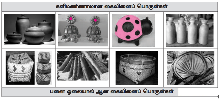 1. உங்கள் பகுதியில் கிடைக்கும் களிமண், பனையோலை போன்ற பொருள்களைப் பயன்படுத்திக் கைவினைப்பொருள்களைச்