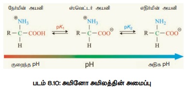 ஒவ்வொரு அமினோ அமிலமும், கார அல்லது அமிலத் தன்மை அல்லது இரண்டையும் பெற்ற அமிலமாக உள்ளது. ஊடகத்தின் pH (ஹைட்ரஜன் அயனிச்செறிவிற்கேற்ப)-ற்கு ஏற்ப அமினோ அமிலம் ஒன்று கார நிலையிலோ, அல்லது அமில நிலையிலோ காணப்படும். ஆகையால் இவை ஆம்போடெரிக் என்று அழைக்கப்படுகிறது. ஒரு குறிப்பிட்ட pH அளவில் கார மற்றும் அமிலத் தன்மை இரண்டையும் வெளிப்படுத்துகிறது. இந்த நிலையில் அது இரு துருவ நிலைபெற்ற ஸ்விட்டர் அயனி என அழைக்கப்படுகிறது. ஸ்விட்டர் அயனி இரண்டு அல்லது மேற்பட்ட செயலாக்கத் தொகுதிகள் கொண்டிருக்கும். இவற்றில் ஒன்று நேர்மின் அயனி, மற்றொன்று எதிர்மின் அயனியாக இருக்கும். இதன் நிகர மின்னூட்டம் பூஜ்யமாகும். இந்த நிலையை அமினோ அமிலத்திற்கு உண்டாக்க உதவும் குறிப்பிட்ட pH நிலைக்கு ஒத்த மின்னிய புள்ளி என்று பெயர் (படம் 8.10).