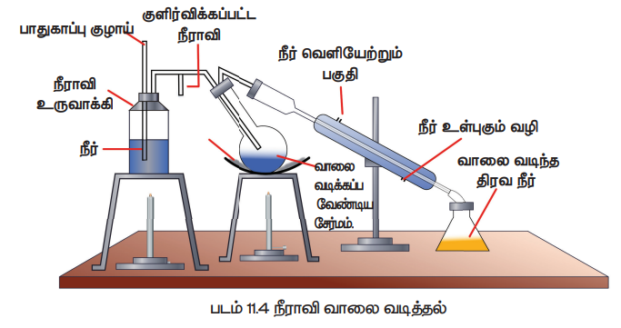 இம்முறை திட மற்றும் திரவப் பொருள்களுக்கு பொருந்தக்கூடியதாகும். இம்முறையில் வாலை வடிக்கப்படும் சேர்மங்கள், நீராவி வெப்ப நிலையில் சிதைவுறாமல் இருத்தல் வேண்டும். 373K வெப்பநிலையில் குறிப்பிடத்தக்க அளவில், உயர் ஆவிஅழுத்த மதிப்பை பெற்றிருக்க வேண்டும். மேலும் சேர்மமானது நீரில் கரையாத தன்மையினையும், கரைந்துள்ள மாசுக்கள் எளிதில் ஆவியாகா தன்மையினையையும் பெற்றிருத்தல் வேண்டும். (படம்: 11.4)