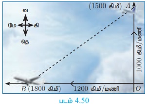 முதல் விமானம் O -வில் இருந்து புறப்பட்டு வடக்கு நோக்கி A என்ற இடத்திற்குச் செல்கிறது என்க. (தொலைவு = வேகம் × நேரம்)