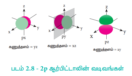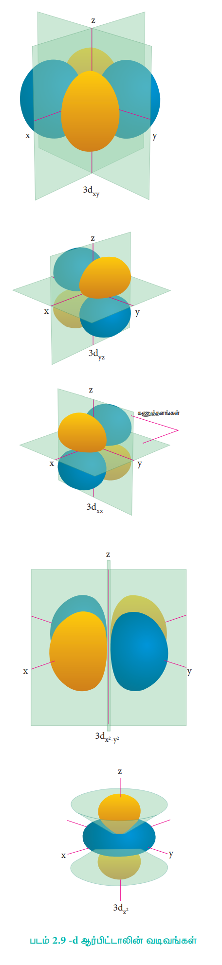 படம் 2.8ல் காட்டப்பட்டுள்ளவாறு 2P ஆர்பிட்டால் ஒரு கணுத்தளத்தினை (nodal plane) பெற்றுள்ளது. d ஆர்பிட்டாலுக்கு l = 2, இதற்கு இணையான m மதிப்புகள் முறையே -2, -1, 0, +1, +2. d ஆர்பிட்டாலானது குளோவர் இலையின் வடிவமைப்பினை ஒத்துள்ளது. m-ன் இந்த ஐந்து மதிப்புகளானது, dx2 – y2, dxy, dz2, dyz, dzx ஆகிய ஐந்து ஆர்பிட்டால்கள் உள்ளதைக் காட்டுகிறது. படம் (2.9)ல் காணப்பட்டுள்ளவாறு, 3d ஆர்பிட்டால் இரு கணுத்தளங்களை(nodal planes)பெற்றுள்ளன.