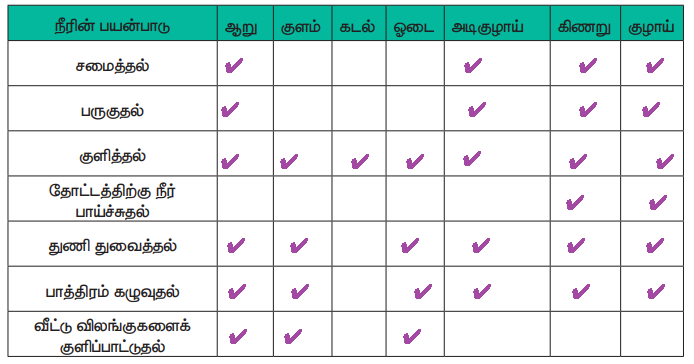 பல்வேறு செயல்களுக்குப் பயன்படும் நீர் ஆதாரங்களைப் பின்வரும் அட்டவணையில் (✓) குறியிட்டு காட்டுக.