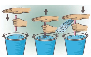 உள்ளீடற்ற குழாயை உங்களது இடது கையால் பிடித்துக்கொண்டு வாளியில் உள்ள நீரில் மேலும் கீழுமாக நகர்த்த வேண்டும். உங்களின் வலது உள்ளங்கையால் குழாயின் மேற்பகுதியை மூடியும் திறந்தும், நீரில் குழாயை மேலும் கீழும் அசைக்க வேண்டும். உடனே நீர் வெளியே வேகமாக வருவதைக் காணலாம். இங்கு இடது கையால் மேலும் கீழும் அசைப்பது நீர் இறைக்கும் செயலைச் செய்கிறது. வலது உள்ளங்கை அடைப்பானாகச் (வால்வு) செயல்படுகிறது. (மாணவர் செயல்பாடு)