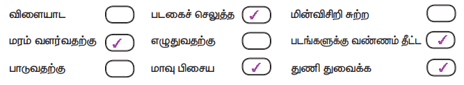 பின்வரும் வினாக்களுக்கு (✓) குறியிடுக. உங்கள் பதில் கொடுக்கப்பட்டுள்ள படங்களிலிருந்து மாறுபட்டால் அருகிலுள்ள கட்டத்தில் அதன் பெயரை எழுதுக.