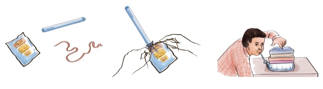 காலியான பால் பாக்கெட், கயிறு, வெற்று மைப்பேனா அல்லது சிறிய நெகிழிக் குழாய்.