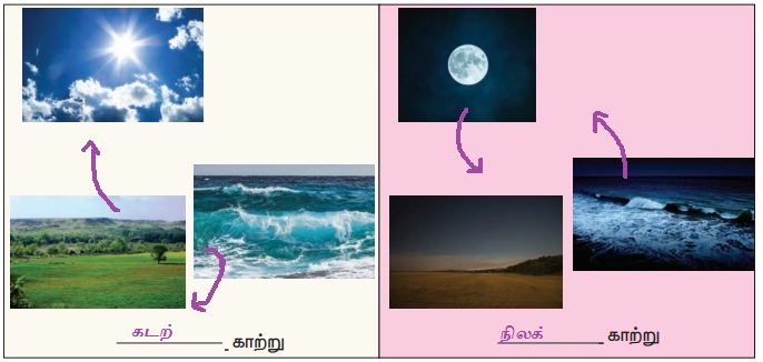 கொடுக்கப்பட்ட படத்தில் கடற்காற்று, நிலக்காற்று வீசும் திசைகளை வரைக.