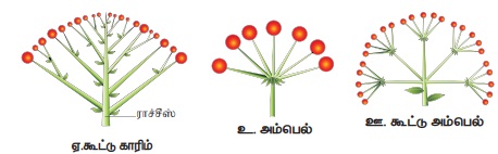அ. காரிம்ப்: இதில் குட்டையான காம்புடைய மலர்கள் மஞ்சரித்தண்டின்