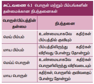 பற்றிய விளக்கம் அட்டவணை 6.1இல் தொகுக்கப்பட்டுள்ளது. இது கதிர் ஒளியியலில் பொருள்கள்
