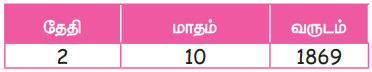 மகாத்மா காந்தியின் பிறந்த நாள் அக்டோபர் 1869 இரண்டாம் நாளாகும். நம் நாட்டில் தேதியைப் பின்வருமாறு குறிக்கின்றோம். 02.10.1869 முதல் 2 இலக்கங்கள் நாளையும் அடுத்த இரண்டு இலக்கங்கள் மாதத்தையும் முன்றாவதாக உள்ள 4 இலக்கங்கள் வருடத்தையும் குறிப்பிடும். பொதுவாக இதனை (தேதே/மாமா/ஆஆஆஆ, dd/mm/yyyy) முறையில் குறிக்கின்றோம்.