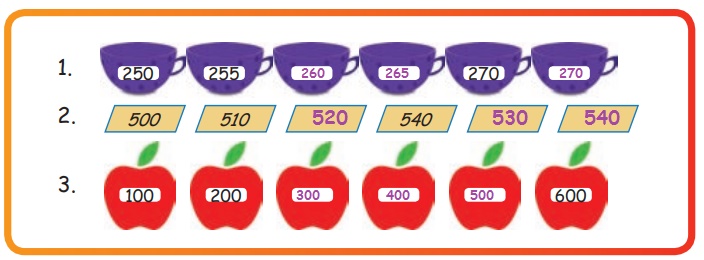பின்வருவனவற்றை 5, 10 மற்றும் 100 களால் தாவி எண்ணி நிரைவு செய்க.