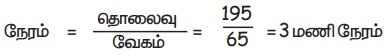 நேரம் = தொலைவு / வேகம் = 195 / 65 = 3 மணி நேரம்