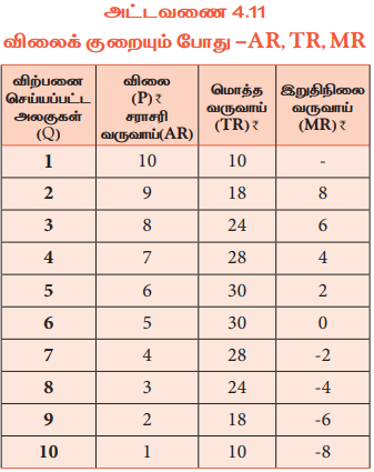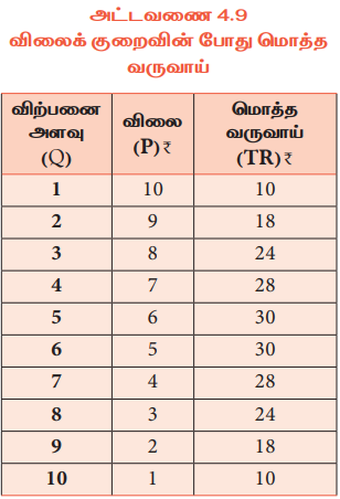 விலை குறையும் போது பண்டங்களின் விற்பனை அதிகரிக்கும். (பொருட்கள் அங்காடியில் நிறைகுறைப் போட்டி நிலவும்போது) இதனால் மொத்த வருவாயில் ஏற்படும் போக்கினை அட்டவணை 4.9 மற்றும் வரைபடம் 4.11 விளக்குகிறது.