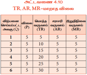 மாறாத விலையில் AR மற்றும் MR வளைகோடானது கீழ்காணும் அட்டவணை 4.10 மற்றும் வரைபடம் 4.12 இல் காட்டப்பட்டுள்ளது.-