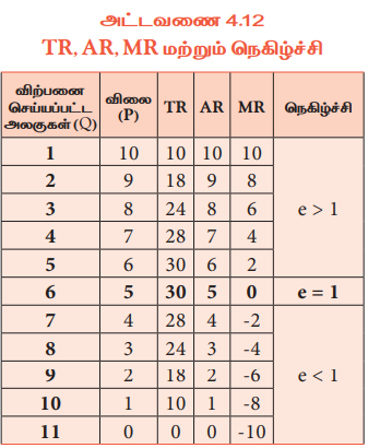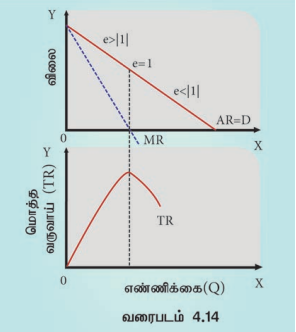 இ) விலைத் தேவை நெகிழ்ச்சி ஒன்றுக்குச் சமமாக இருக்கும் போது MR பூஜ்ஜியத்துக்கு சமமாக இருக்கும் அப்போது TR உச்சத்தில் மாறாமல் இருக்கும்.
