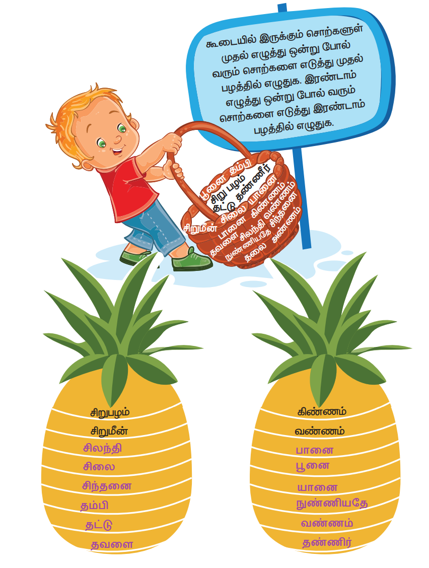 வரும் சொற்களை எடுத்து முதல் பழத்தில் எழுதுக. இரண்டாம் எழுத்து ஒன்று போல் வரும்