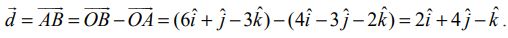 A, B என்பவை குறிக்கும் புள்ளிகள் முறையே (4,−3,−2), (6,1,−3) என்க. துகளின் இடப்பெயர்ச்சி வெக்டர்