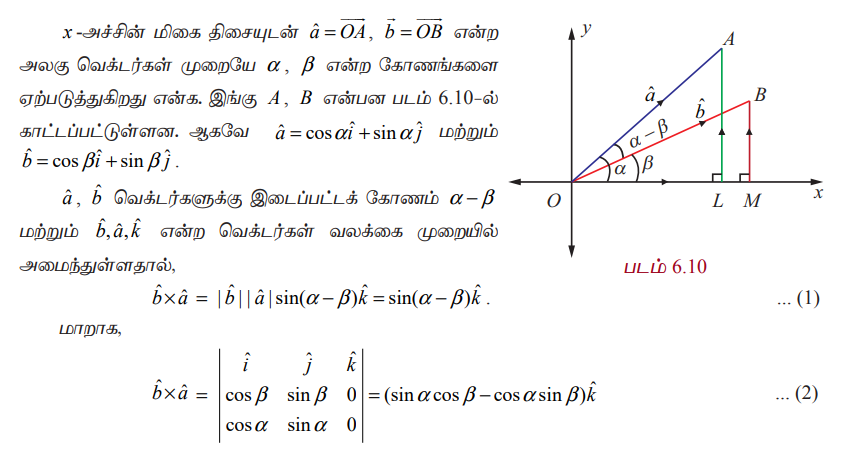 என்ற அலகு வெக்டர்கள் x−அச்சின் மிகை திசையுடன் முறையே α, β என்ற கோணங்களை ஏற்படுத்துகிறது என்க. இங்கு A, B என்பன படம் 6.8−ல் காட்டப்பட்டுள்ளன. AL மற்றும் BM என்பவற்றை x−அச்சுக்கு செங்குத்தாக வரைக.