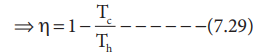 ⇒ η = 1 – (Tc / Th) ---------- (7.29)