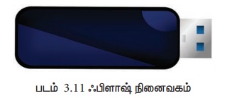 ஃபிளாஷ் நினைவகம் ஒரு மின்னனு (திட நிலை) அழிவுறாத சேமிக்கும் சாதனமாகும். மேலும் மின்சாரத்தின் மூலம் நிரல்களை அழித்து, மறுபடியும் நிரலாக்க முடியும். ஃபிளாஷ் நினைவகம் ஒரு EEPROM அல்லது EPROM வகைப்படும். பென் டிரைவ் (Pen drive), மெமரி கார்டு (Memory card) போன்றவை ஃபிளாஷ் நினைவகத்திற்கான எடுத்துக்காட்டுகளாகும். தனியாள் கணிப்பொறி (Personal Computer), தன்னுடை இலக்க வகை உதவியாளர் (Personal Digital Assistant), டிஜிட்டல் ஆடியோ பிளேயர்கள், டிஜிட்டல் கேமிரா, கையடக்க தொலைபேசிகள் (மொபைல் தொலைபேசி) போன்றவற்றில் இவ்வகை ஃபிளாஷ் நினைவகம் உபயோகிக்கப்படுகிறது. ஃபிளாஷ் நினைவகம் வேகமாக அணுகல் நேரத்தை வழங்குகிறது. நினைவகத்தில் ஒரு எழுத்துருவை படிக்க அல்லது எழுத பயன்படும் நேரத்தை அணுகல் நேரம் எனப்படும். ஃபிளாஷ் நினைவகம் கொள்ளளவு 1 ஜிகா பைட்ஸ் (GB) - யிலிருந்து 2 டெரா பைட்ஸ் (TB) வரையில் கிடைக்கும். படம் 3.11-ல் ஃபிளாஷ் நினைவகத்தின் ஒரு மாதிரியைக் காணலாம்.