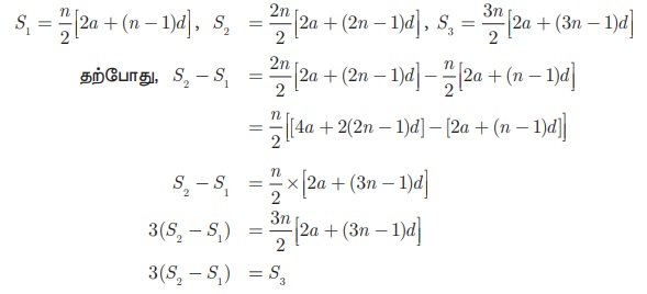S1, S2 மற்றும் S3 என்பன முறையே ஒரு கூட்டுத் தொடர்வரிசையின் முதல் n, 2n மற்றும் 3n உறுப்புகளின் கூடுதல் ஆகும். S3 = 3(S2 −S1 ). என நிறுவுக.