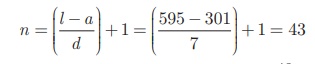 முதல் உறுப்பு a = 301; பொது வித்தியாசம் d = 7; கடைசி உறுப்பு l = 595.