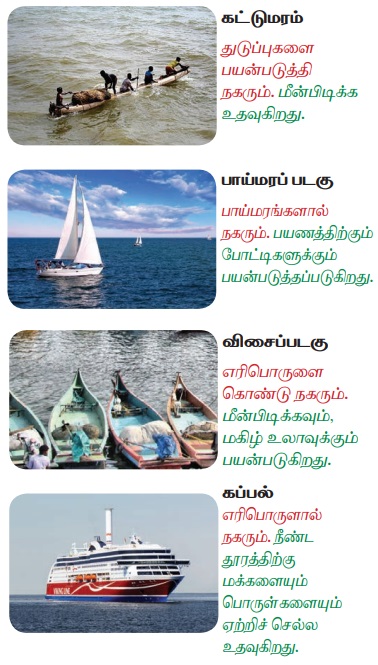 அம்மா: இவற்றுள் சிறியதாக இருப்பவை படகுகள் மற்றும் பெரியதாக இருப்பவை கப்பல்கள். கப்பல் மூலம் ஒரு நாட்டிலிருந்து மற்றொரு நாட்டிற்கு அதிக அளவிலான பயணிகளையும் சரக்குப் பொருள்களையும் ஏற்றிச் செல்லலாம்.